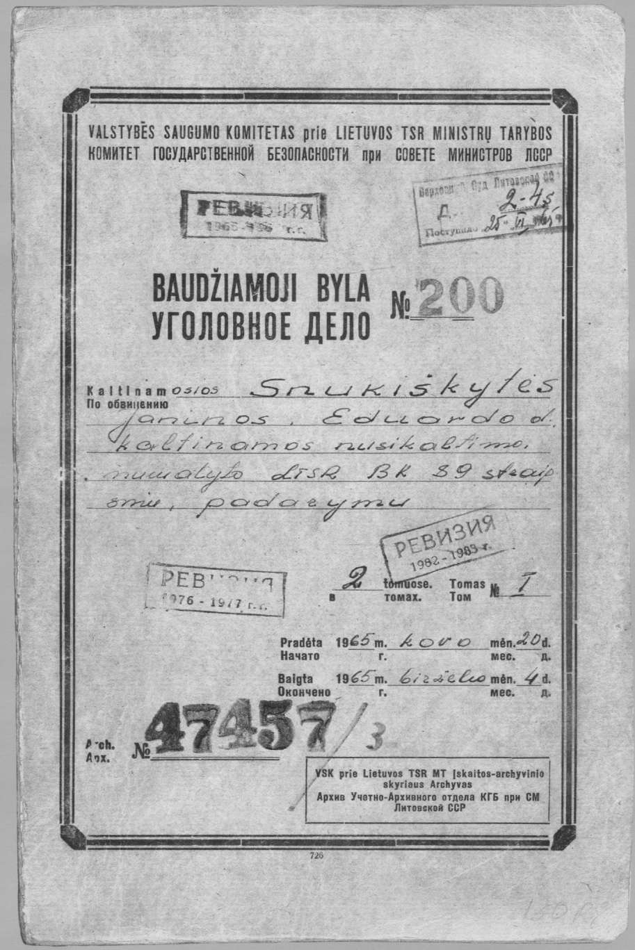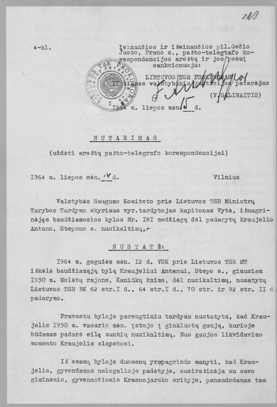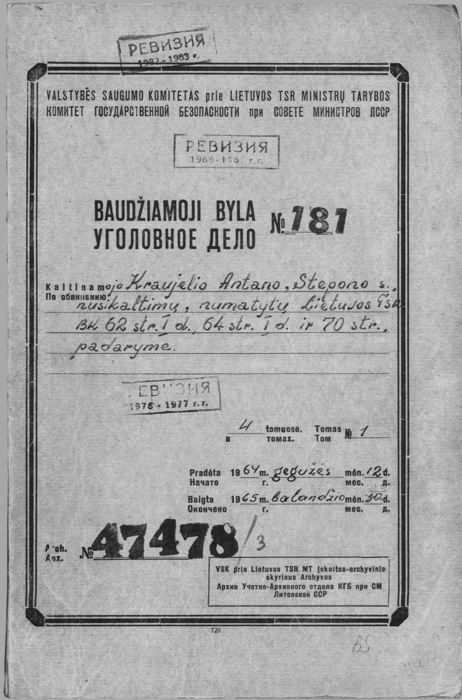 Antano Kraujelio baudžiamoji byla Nr. 181 (4 tomai). Pradėta 1964 05 12, baigta