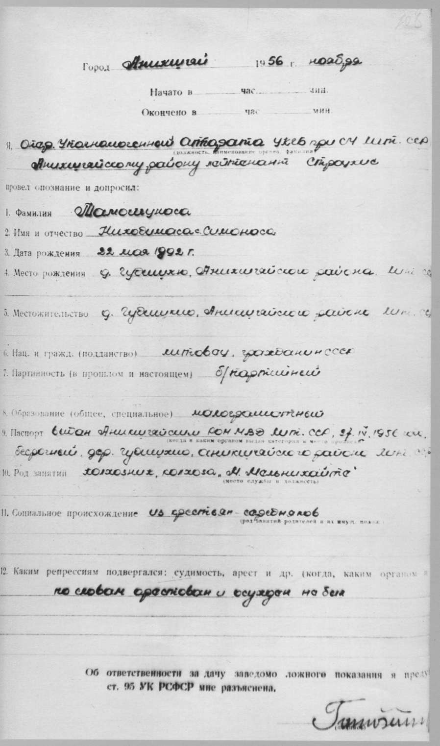 Nikodemo Tamošiūno apklausos protokolas. 1956 m. lapkritis