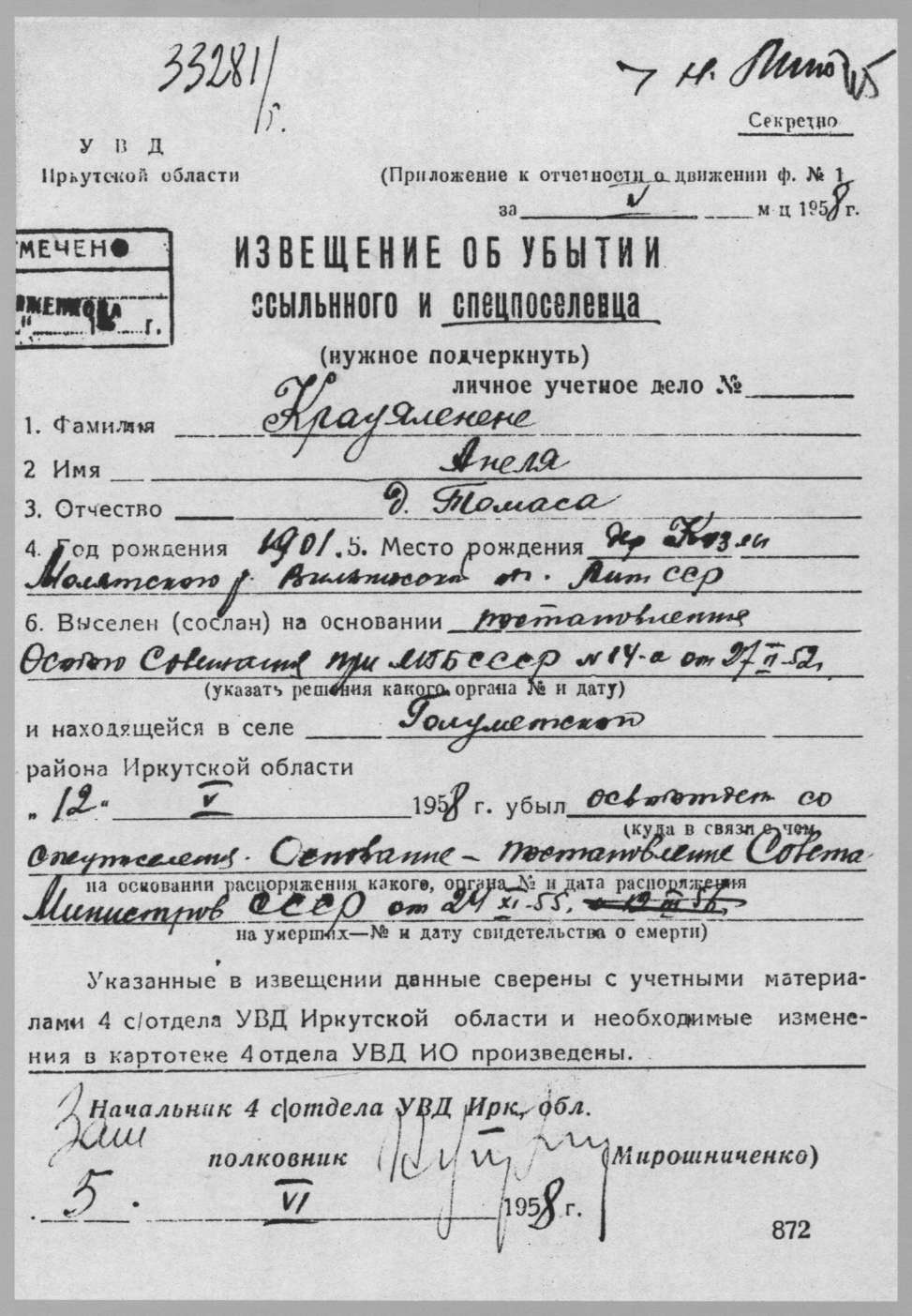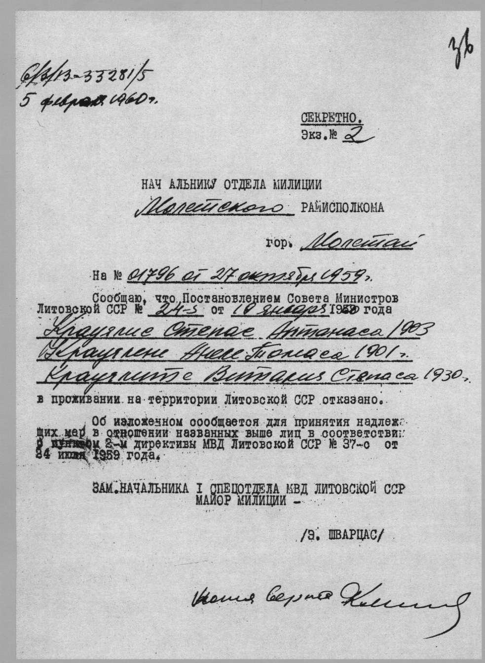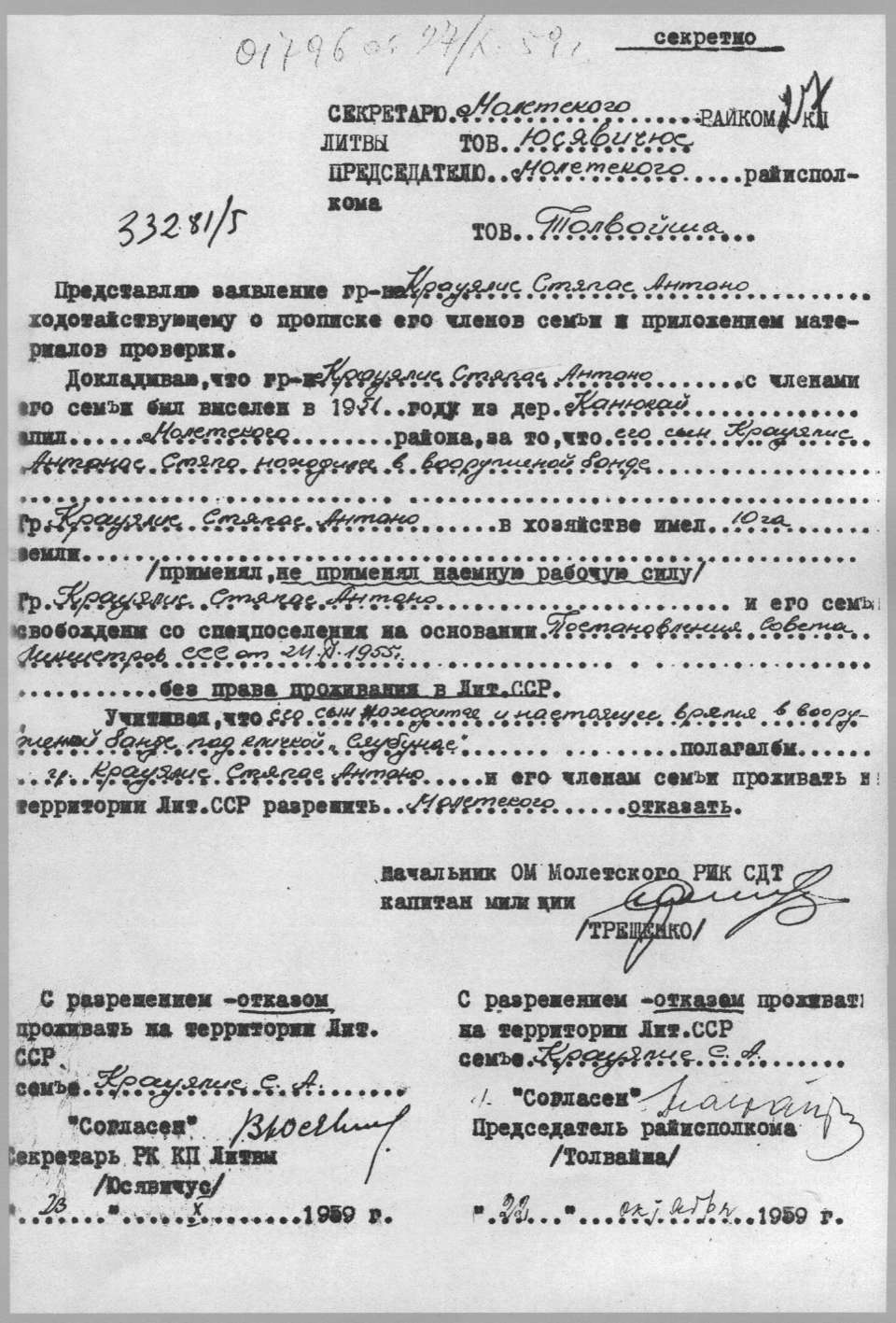 LTSR Molėtų KP sekretoriui Jucevičiui ir Molėtų vykdomojo komiteto pirmininkui Tolvaišai skirtas milicijos kapitono Treščenkos parėdymas neleisti Stepono Kraujelio šeimai gyventi LTSR teritorijoje. 1959 10 22