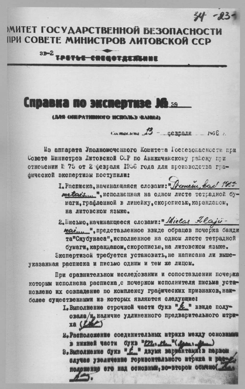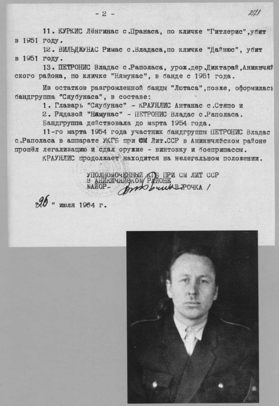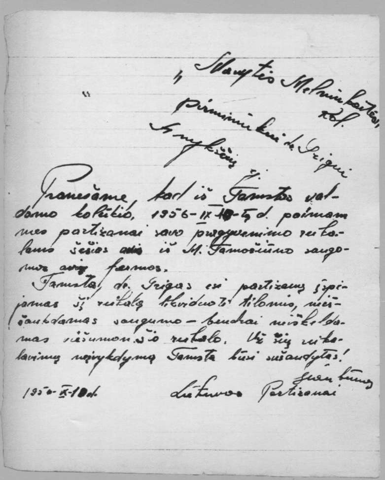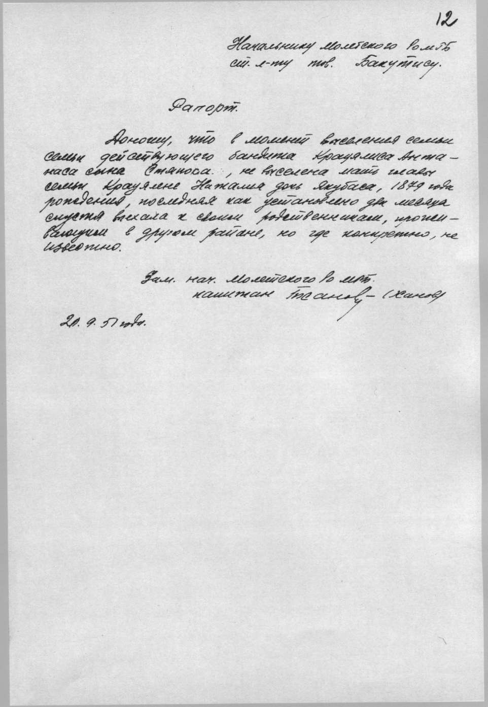 LTSR Molėtų KP sekretoriui Jucevičiui ir Molėtų vykdomojo komiteto pirmininkui Tolvaišai skirtas milicijos kapitono Treščenkos parėdymas neleisti Stepono Kraujelio šeimai gyventi LTSR teritorijoje. 1959 10 22