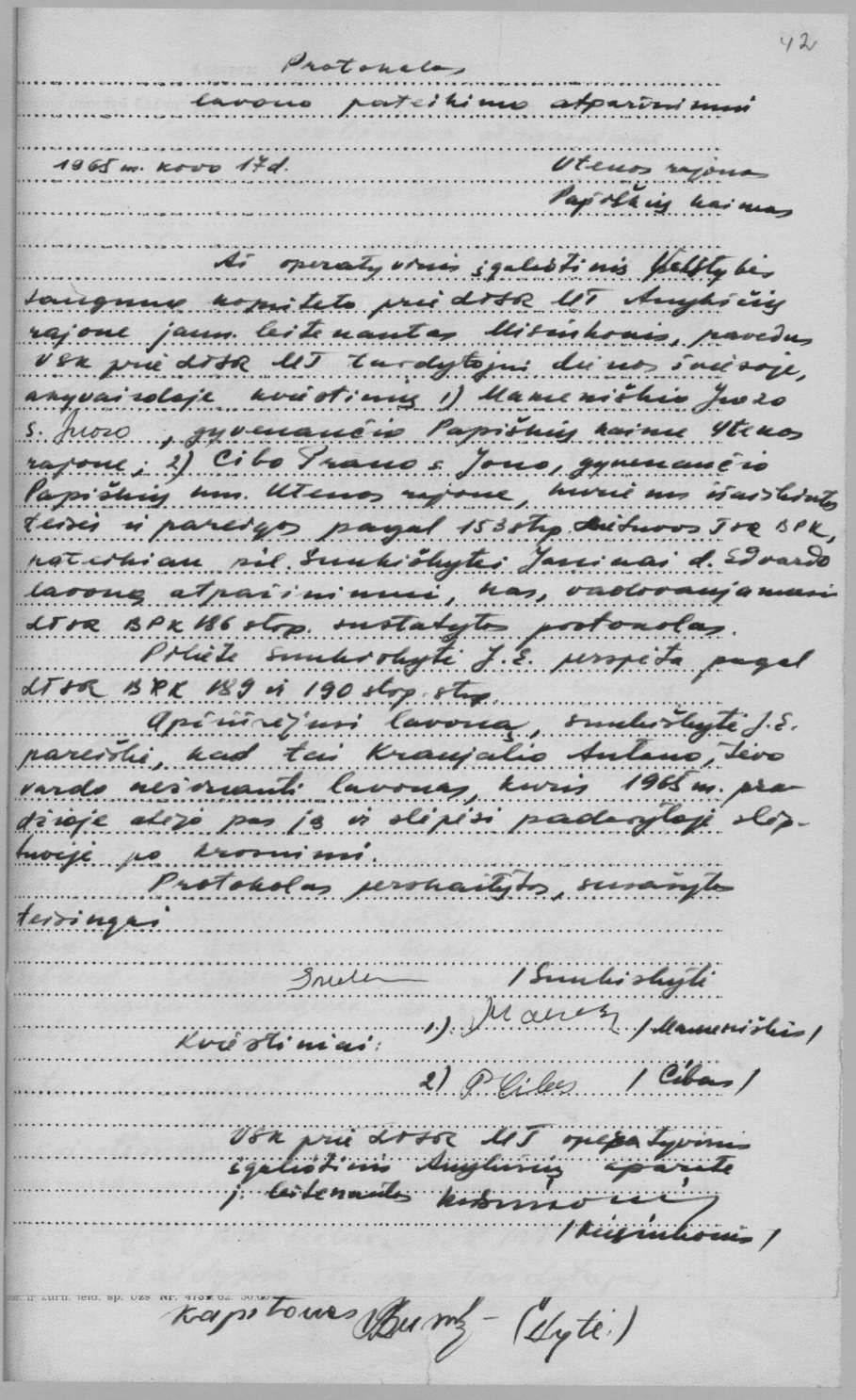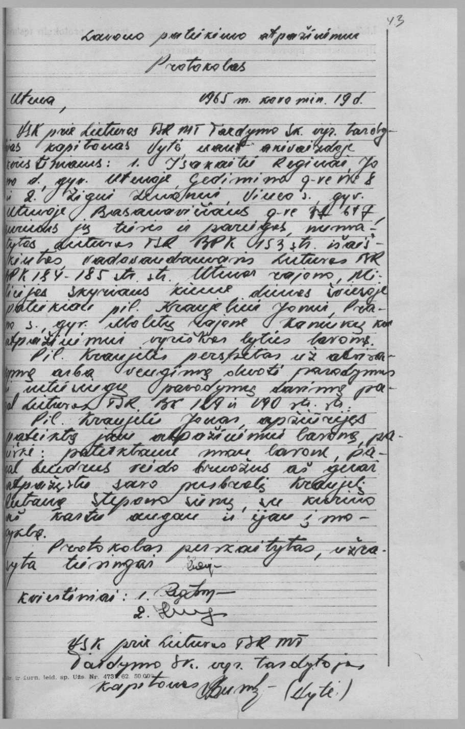 Lavono pateikimo atpažinti protokolas, pasirašytas Jono Kraujelio. 1965 03 17