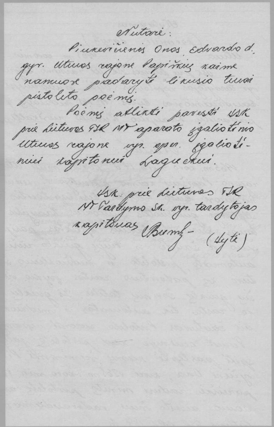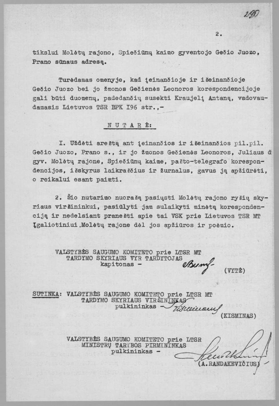 Valstybės saugumo komiteto prie LTSR MT tardymo skyriaus tardytojo vyr. leitenanto Vilimo pavedimas M. Misiukoniui atlikti kratą pas pilietę Genę Ruzgutę. 1965 05 11