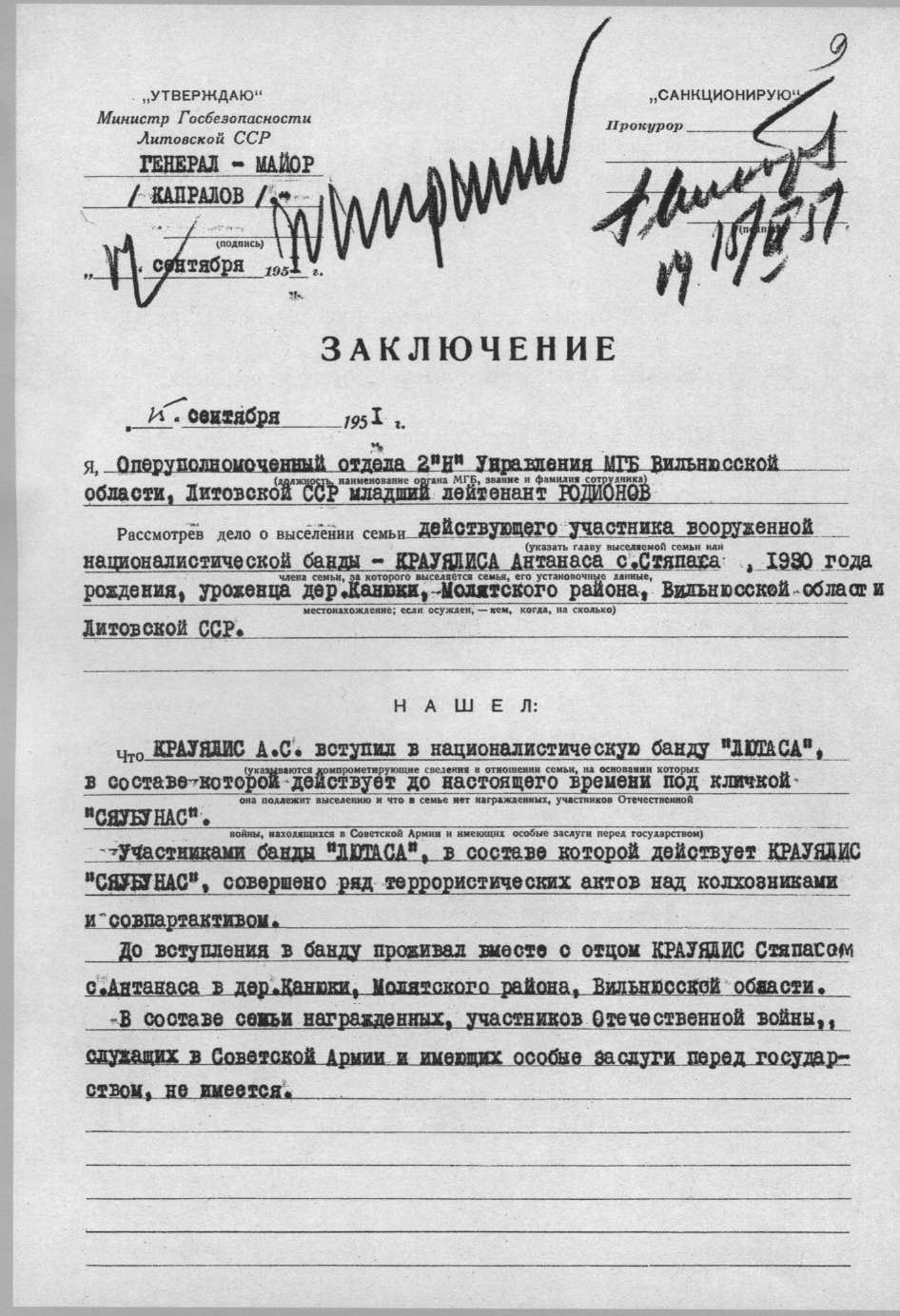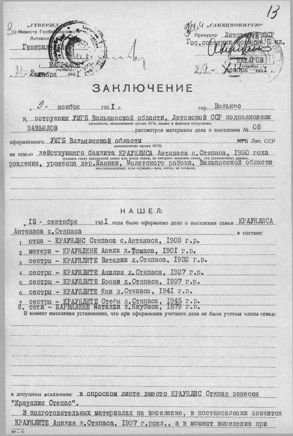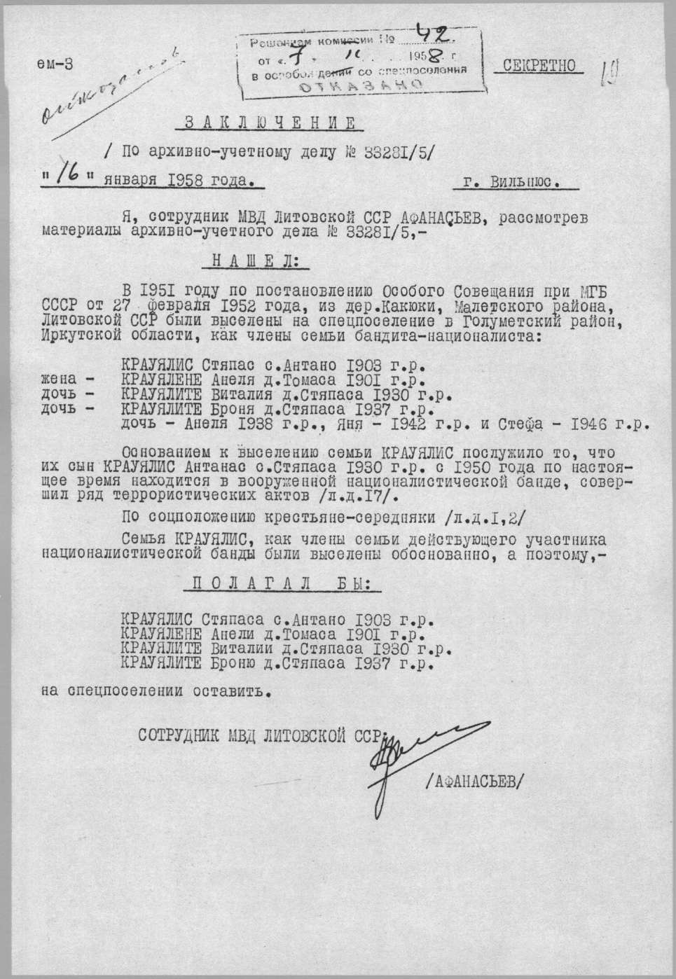 LTSR VRM pareigūno Afanasjevo sprendimas pratęsti Steponono Kraujelio šeimos