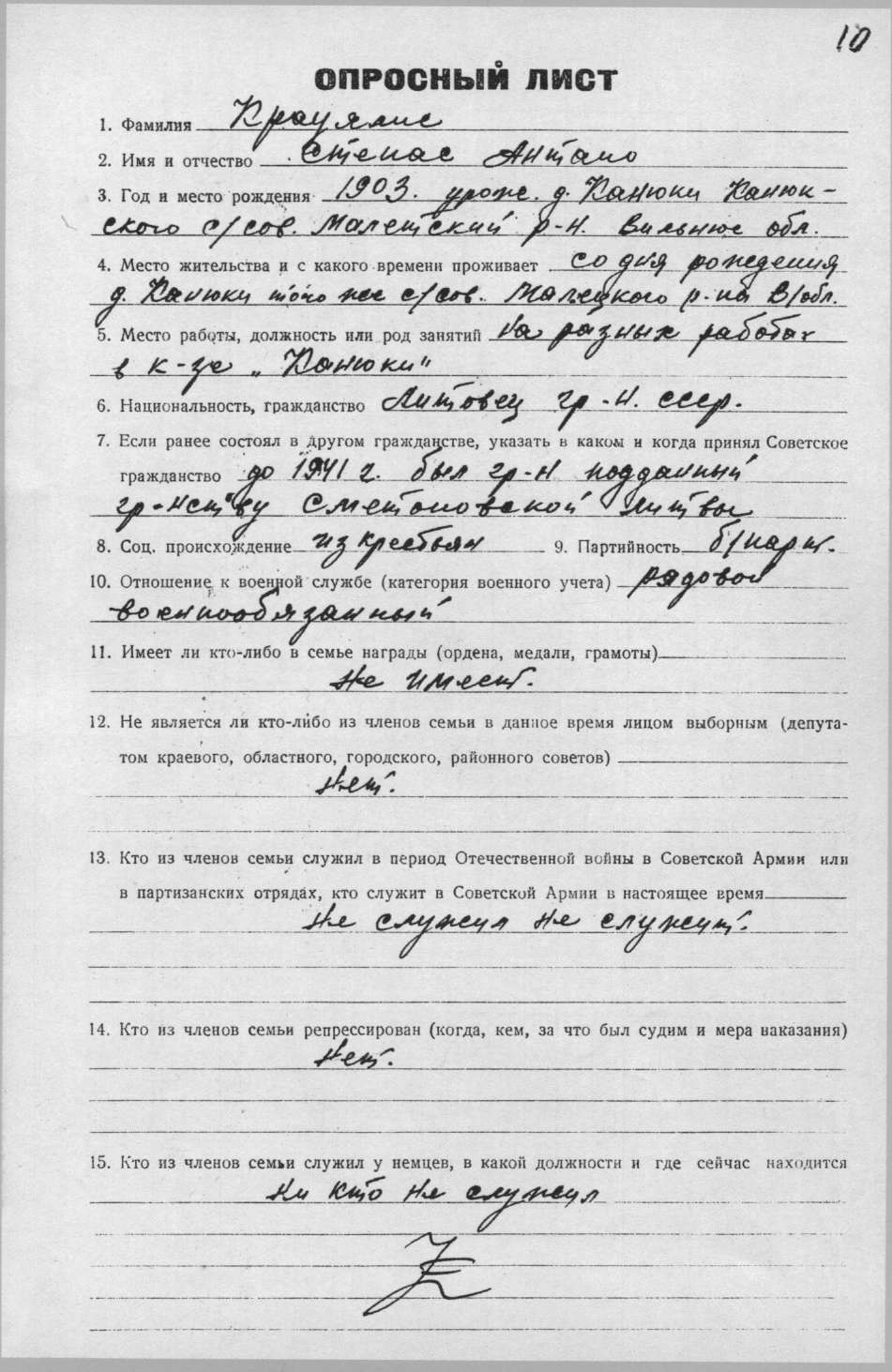 Stepono Kraujelio apklausos lapas. 1951 09 20