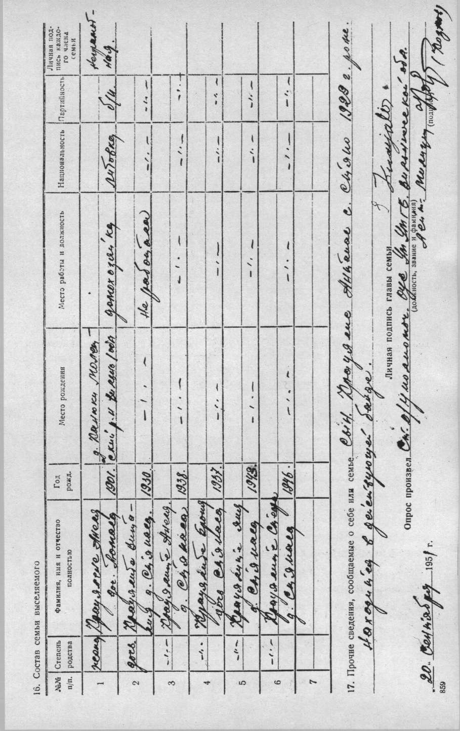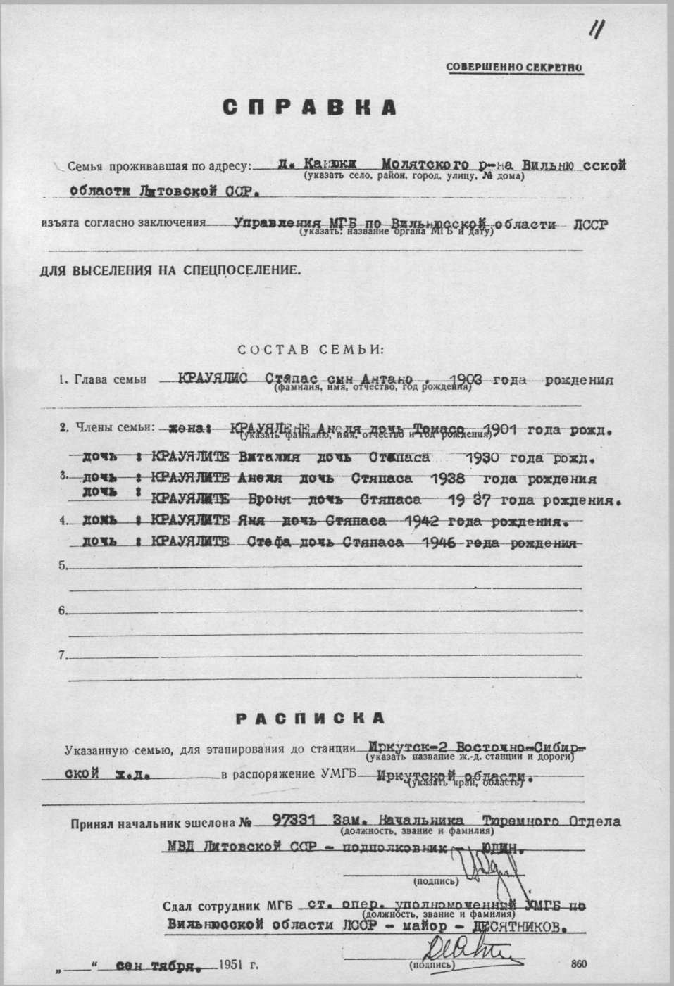 Pažyma apie Stepono Kraujelio šeimos trėmimą.