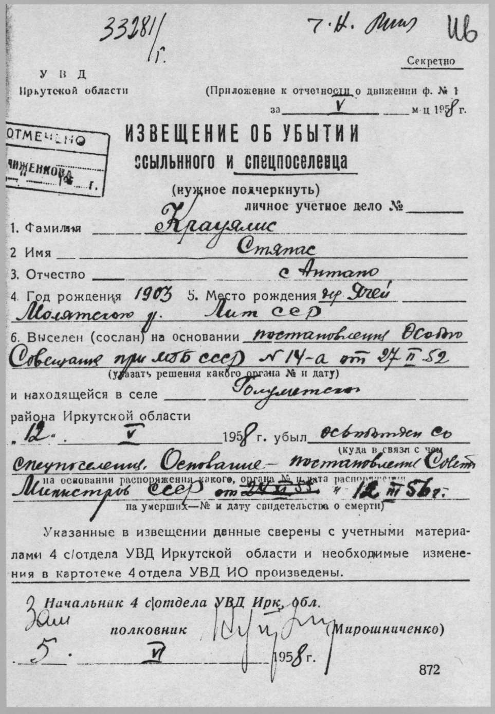 LTSR VRM pirmo specialiojo skyriaus milicijos vyresniojo leitenanto Kubilskio sprendimas drausti Stepono Kraujelio šeimai gyventi LTSR. 1959 12 21