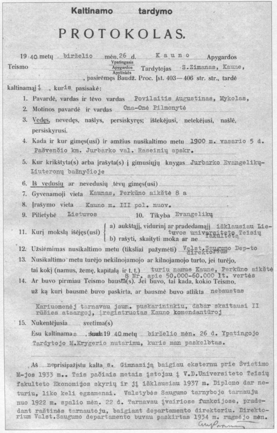 Augustino Povilaičio tardymo protokolas..................................... 110